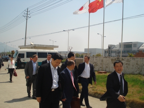 圖為莫夫昌副州長(zhǎng)(右2)一行在巢湖嘉誼朱玉倉(cāng)總經(jīng)理(右1)帶領(lǐng)下參觀工廠