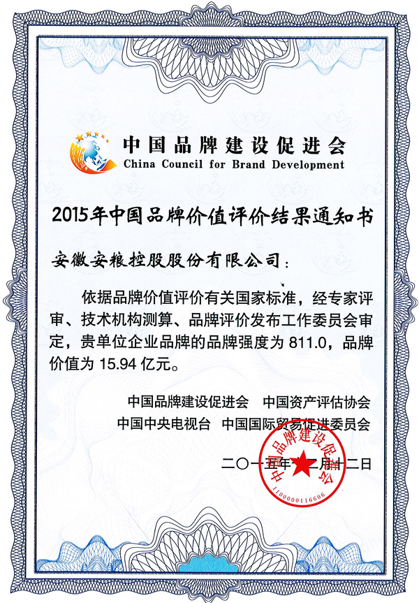 12月12日,由中國品牌建設促進會、中央電視臺、中國資產(chǎn)評估協(xié)會、中國國際貿(mào)促會等聯(lián)合舉辦的“2015年中國品牌價值評價信息發(fā)布暨2015中國品牌發(fā)展論壇”在北京舉行。經(jīng)公司統(tǒng)一組織申報,“安糧”作為企業(yè)品牌榮登榜單,品牌價值15.94億元。
