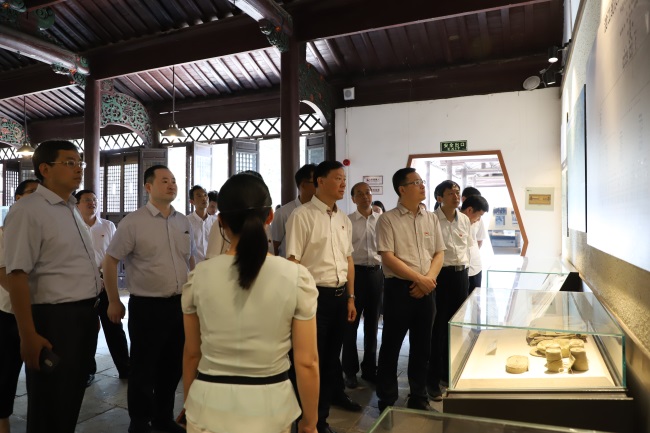 在瑤崗渡江戰(zhàn)役總前委舊址,黨員同志們在現場講解員的帶領下,認真觀看渡江戰(zhàn)役紀錄片,細致瀏覽一張張泛黃的歷史照片和珍貴的文獻實物,仔細端詳著陳舊卻依舊閃光的戰(zhàn)斗槍支、大刀和一件件浸潤著先烈血汗的棉褥、草鞋,在生動的講述中,感受70年前那段慷慨激昂、艱苦卓絕的革命歲月。