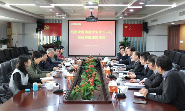 11月28日,安徽省商務廳朱丹副廳長到公司開展外貿(mào)工作調(diào)研,一同調(diào)研的有省商務廳貿(mào)發(fā)處、貿(mào)管處、產(chǎn)業(yè)處相關領導。國貿(mào)集團黨委書記、董事長范陽率安糧集團領導班子及貿(mào)易板塊主要負責人參加調(diào)研座談。