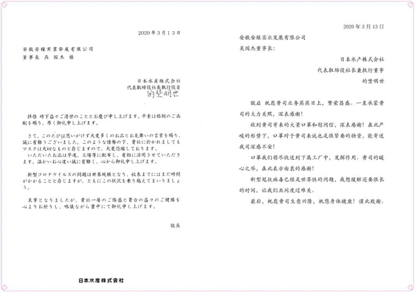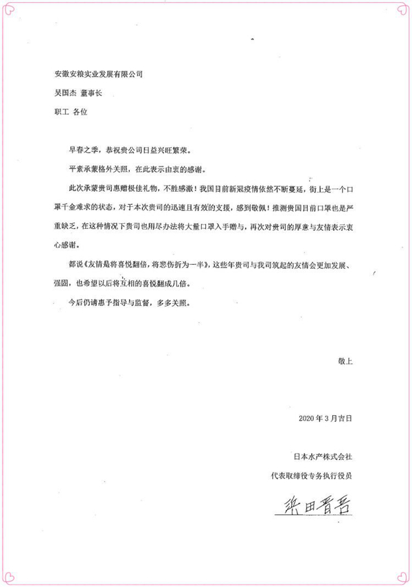 日本水產(chǎn)株式會社向安糧實(shí)業(yè)寄來捐贈口罩感謝信