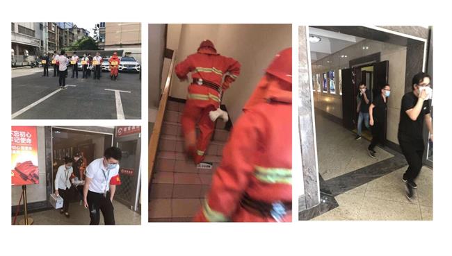 按照演習(xí)安排,監(jiān)控中心監(jiān)控員接到火警報(bào)告,大廈12樓貨梯口發(fā)現(xiàn)火情,通知巡邏崗隊(duì)員立即到報(bào)警現(xiàn)場(chǎng)確認(rèn),巡邏崗到達(dá)現(xiàn)場(chǎng)發(fā)現(xiàn)大廈12樓失火。滅火組攜帶滅火器材、破拆工具趕到火災(zāi)現(xiàn)場(chǎng)進(jìn)行撲救。疏散組迅速按緊急預(yù)案的疏散線路帶領(lǐng)業(yè)主們,捂住口鼻,壓低身子,有序撤離。同時(shí),救護(hù)組在濃煙中救出被困傷員,進(jìn)行緊急救治,現(xiàn)場(chǎng)做到了快速、安全、有序。